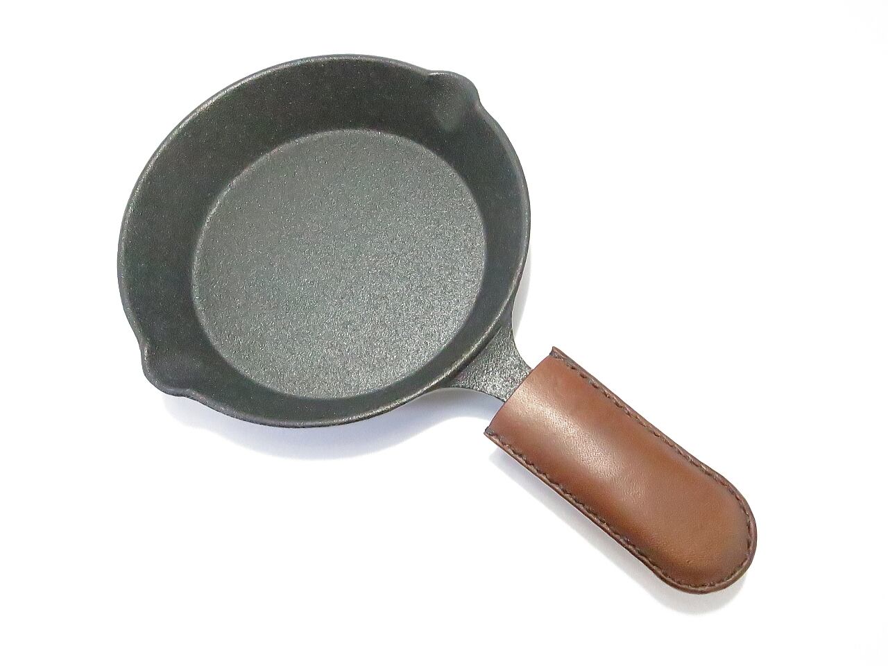 スキレットハンドルレザーカバーです。こちらはニトリのスキレットのサイズになります。スキレットはつきません。革厚みは、3mmになります。ロッジ用も制作可能です、ご希望のサイズで制作できますのでお問い合わせください。