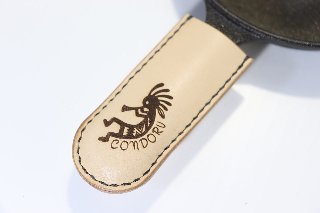 スキレットハンドルレザーカバーになります。ココペリ柄が入っています。スキレットはつきません。革色、糸色をお選びいただけます。ご購入後、お問い合わせよりご指定ください。文字入れ無料です。ご希望の方はご連絡ください。